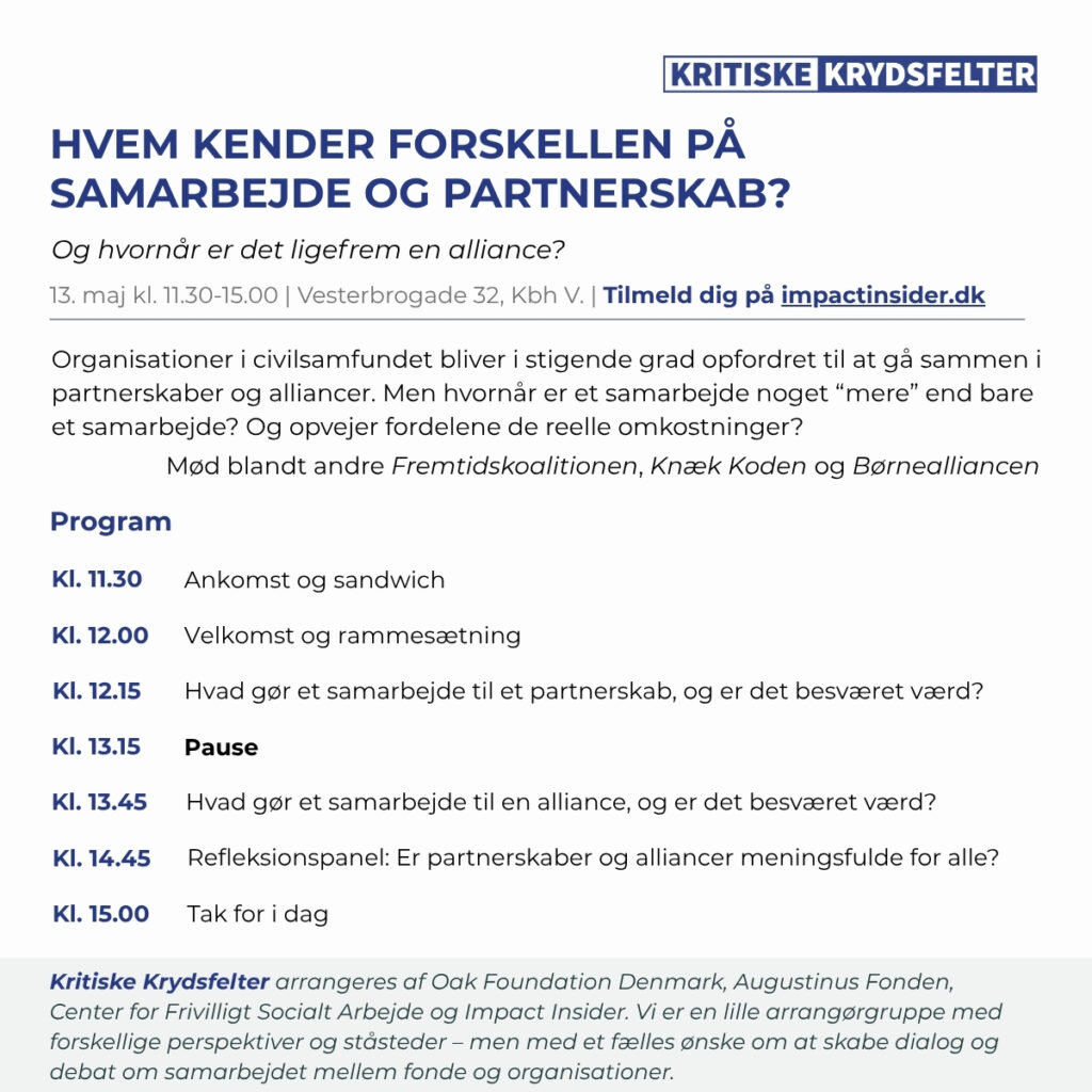 Kritiske Krydsfelter arrangeres af Oak Foundation Denmark, Augustinus Fonden, Center for Frivilligt Socialt Arbejde og Impact Insider. Vi er en lille arrangørgruppe med forskellige perspektiver og ståsteder – men med et fælles ønske om at skabe dialog og debat om samarbejdet mellem fonde og organisationer.